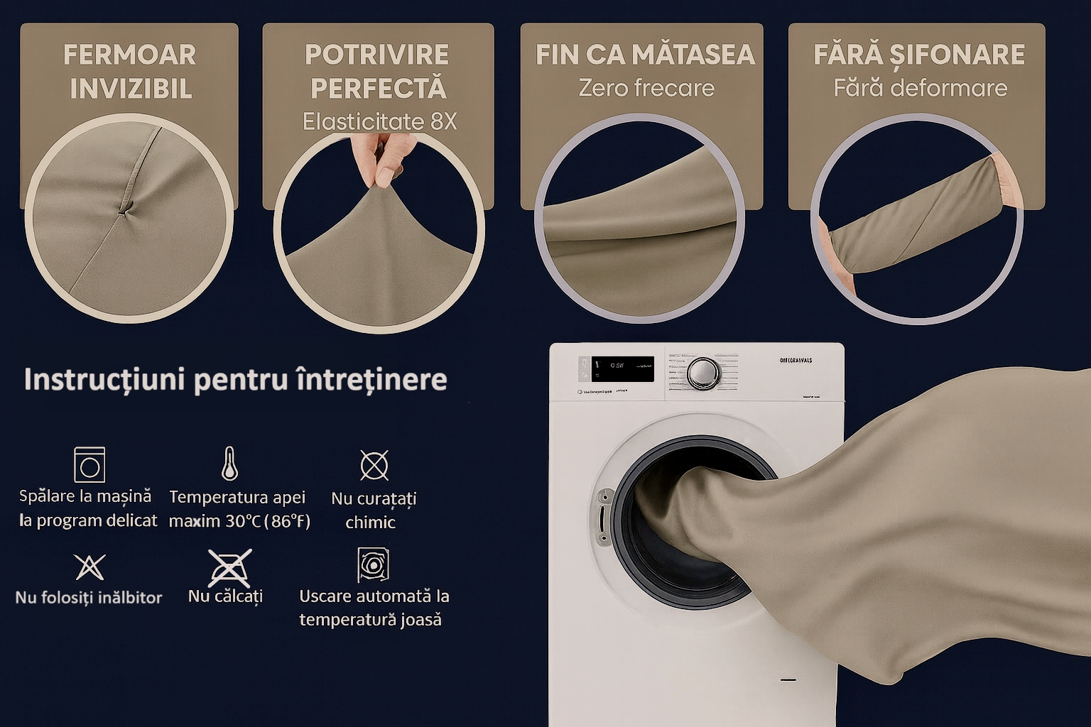 Se mulează strâns pe pernă, nu alunecă și protejează fața de contactul direct cu fermoarul.